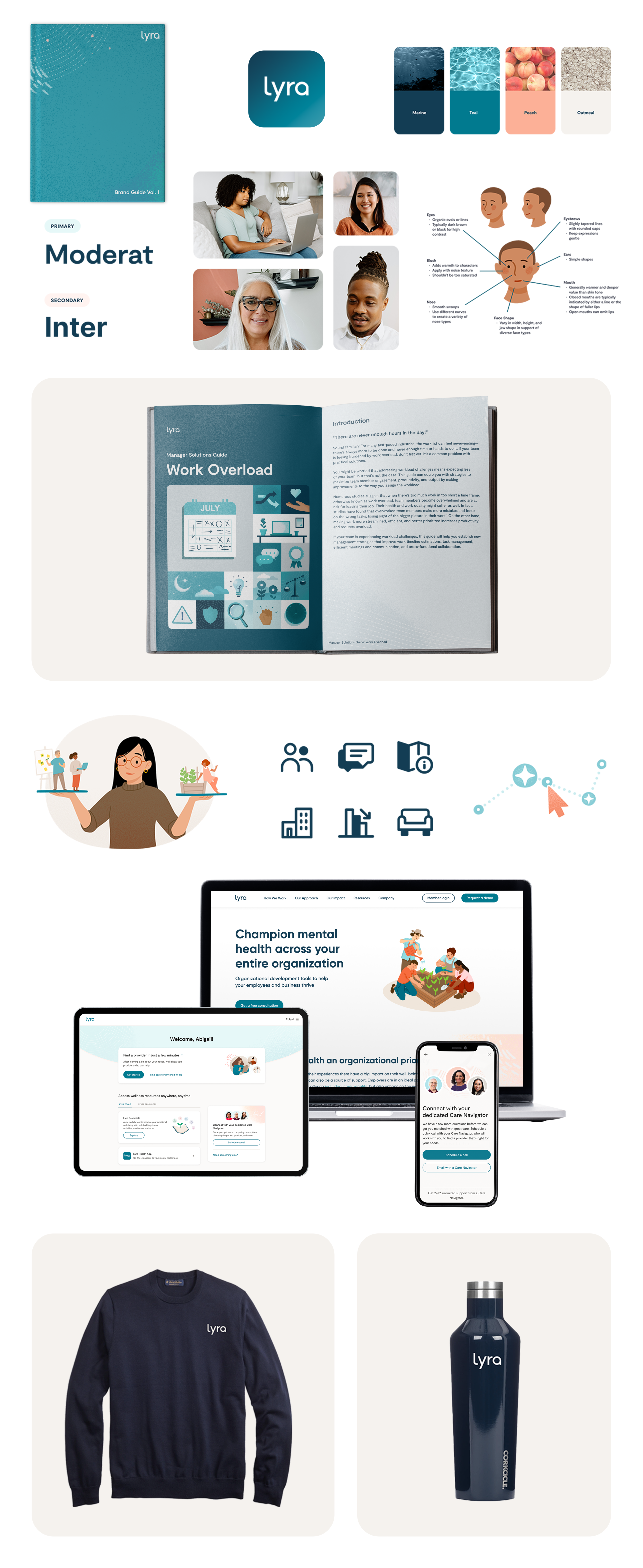 In 2022 Lyra Health went through a brand refresh in collaboration with the marketing creative team, product design, and our content team. Together over a span of four months we delivered a completed 70 page refresh to our brand guide that included a competitive analysis, survey results from our customers, updated accessibility standards, and many FigJam working sessions. The goal was to create a brand that improved how we spoke to our core audiences while maintaining a unique, beautiful, and engaging experience. We wanted to create a brand that wasn’t too cold and rigid, but also not too warm and whimsy. At the end of our exploration we implemented a new typeface, updated color palette, updated icon library, and a complete refresh of our illustration style.